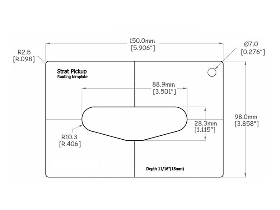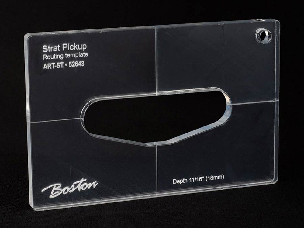 Pickup routing template made of 8mm thick clear acrylic to create perfectly shaped pickup cavities. Accurate template placement is easy: crystal clear routing templates allow you to see the guitar body underneath. Simply align the template's laser etched centre lines with the markings on your guitar to get the placement right every time.