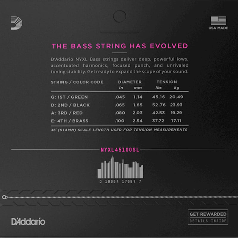 D'Addario's NYXL electric bass string sets feature the innovative combination of NYXL nickel-plated wrap wire wound on our NY Steel core for expanded dynamic range and harmonic response. NYXL45100SL provides players with an extremely versatile, super long scale string in our most popular string gauge.