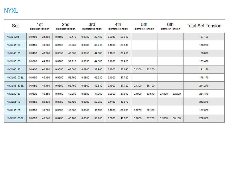 D’Addario NYXL guitar strings will bend farther, sing louder, and stay in tune better than any string you’ve played before. Envisioned, perfected, and manufactured by D’Addario in New York, this newly engineered, break-resistant, high-carbon steel core and plain steel alloy delivers a whole new level of freedom, confidence, and power. NYXL’s provide more strength and up to 131% greater tuning stability by utilizing a completely reinvented wire drawing process coupled with a revolutionary “fusion twist” process for the plain steels. The reformulated nickel plated string windings have greater magnetic properties resulting in higher output and enhanced mid-range frequency response for more presence and crunch.