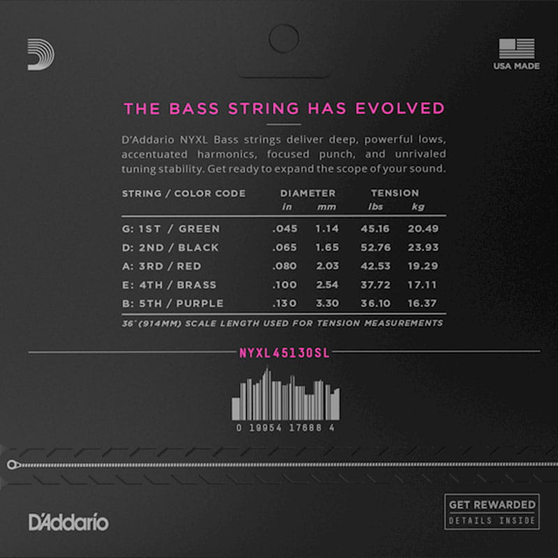 D'Addario's NYXL electric bass string sets feature the innovative combination of NYXL nickel-plated wrap wire wound on our NY Steel core for expanded dynamic range and harmonic response. NYXL45130SL provides 5-string players with an extremely versatile string set, including a deep, tight, low B-string, in super long scale.