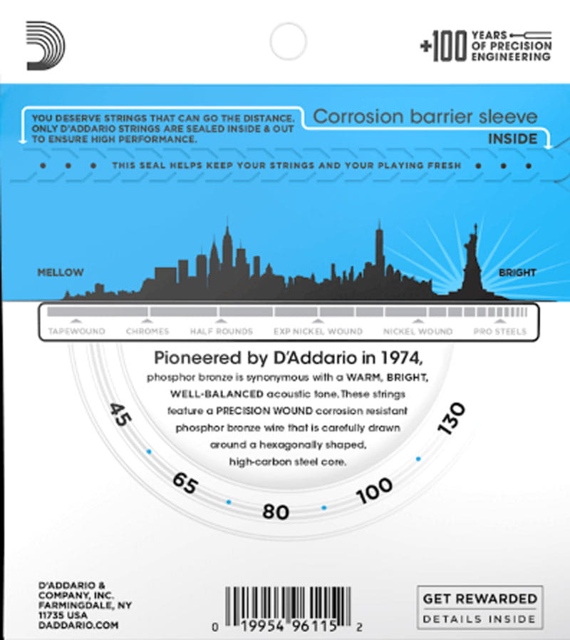 Phosphor Bronze was introduced to string making by D'Addario in 1974 and has become synonymous with warm, bright, and well balanced acoustic tone. D'Addario Phosphor Bronze strings are precision wound with corrosion resistant phosphor bronze onto a carefully drawn, hexagonally shaped, high carbon steel core. The result is long lasting, bright sounding tone with excellent intonation.