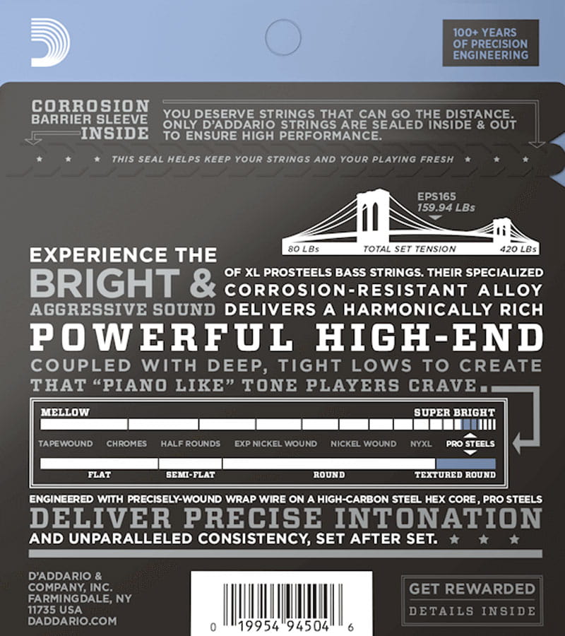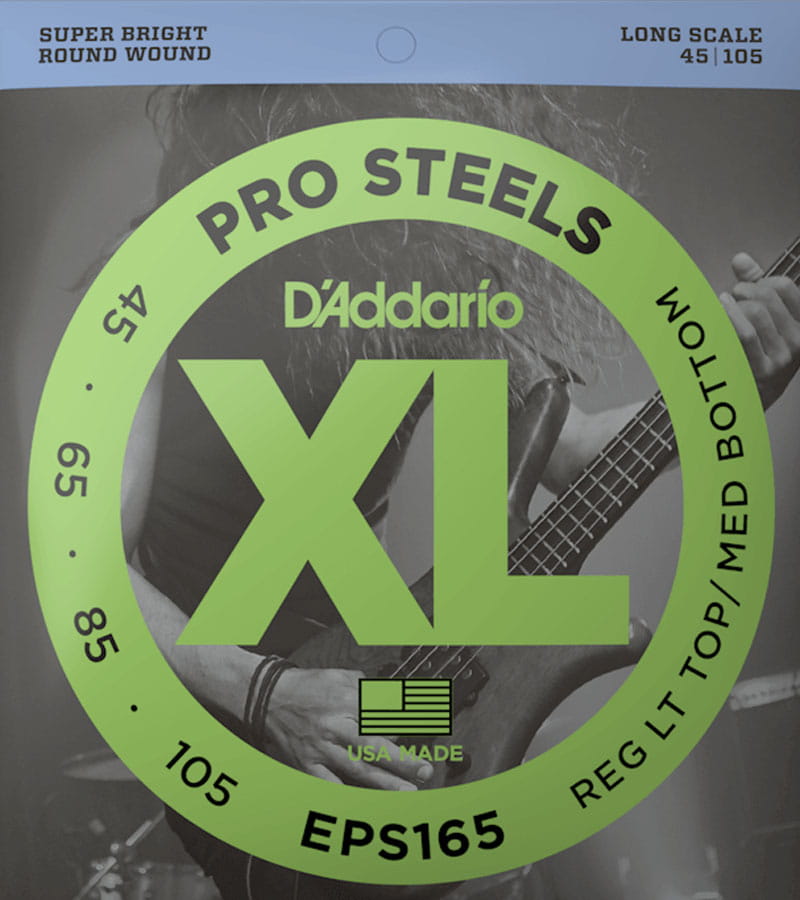 EPS165 is a popular D'Addario hybrid bass set combining the high strings from an EPS170 (.45 and .65) with the low strings from an EPS160 (.85 and .105). This set is optimal for players looking for the ideal combination of biting high end, punchy lows and super long life. Fits basses with a string scale length of up to 36 7/8 inches.