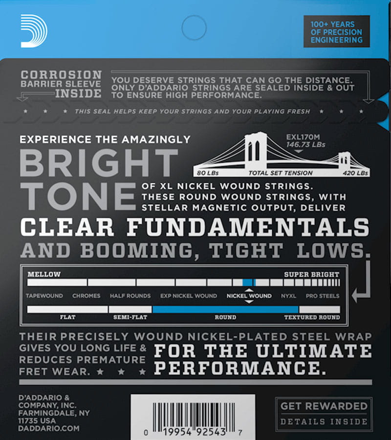 EXL170M is D'Addario's best-selling bass guitar set optimized for medium scale basses. XL Nickel Wound electric bass strings, long recognized as the industry standard, are ideal for a wide range of musical styles.