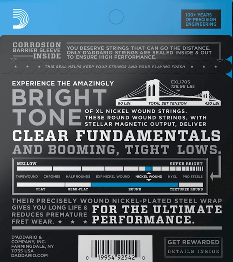 EXL170S is D'Addario's best-selling bass guitar set optimized for short scale basses. XL Nickel Wound electric bass strings, long recognized as the industry standard, are ideal for a wide range of musical styles.
