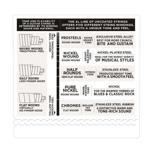 XL Nickel Wound, D'Addario's most popular electric guitar strings, are precision wound with nickelplated steel onto a carefully drawn, hexagonally shaped, high carbon steel core. The result, strings with long lasting, distinctive bright tone and excellent intonation, is ideal for the widest variety of guitars and musical styles.
