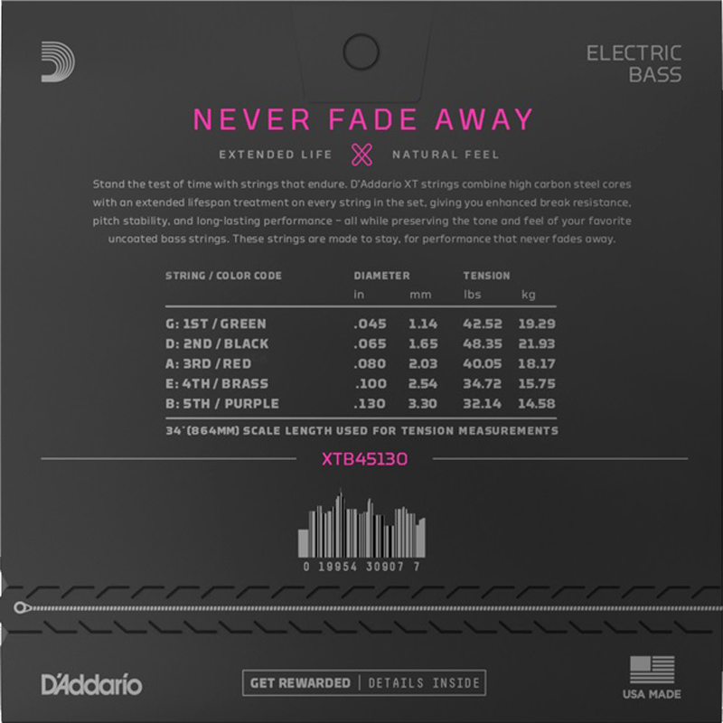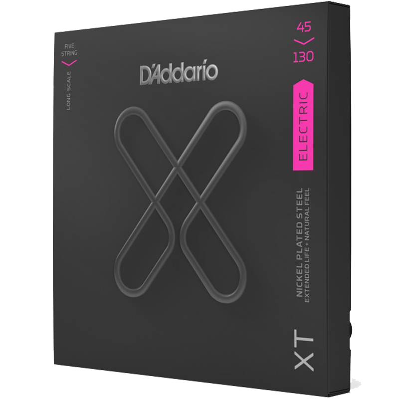 D'Addario XT Bass Nickel Plated Steel strings combine our most popular electric bass guitar alloy with an advanced corrosion resistance treatment on every string in the set, preserving the natural tone and feel of uncoated strings. Available in a variety of gauges for 4 and 5 string, long scale basses.