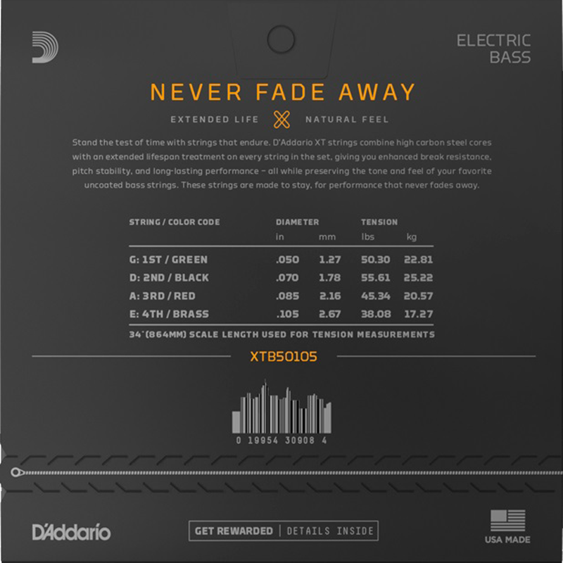 D'Addario XT Bass Nickel Plated Steel strings combine our most popular electric bass guitar alloy with an advanced corrosion resistance treatment on every string in the set, preserving the natural tone and feel of uncoated strings. Available in a variety of gauges for 4 and 5 string, long scale basses.