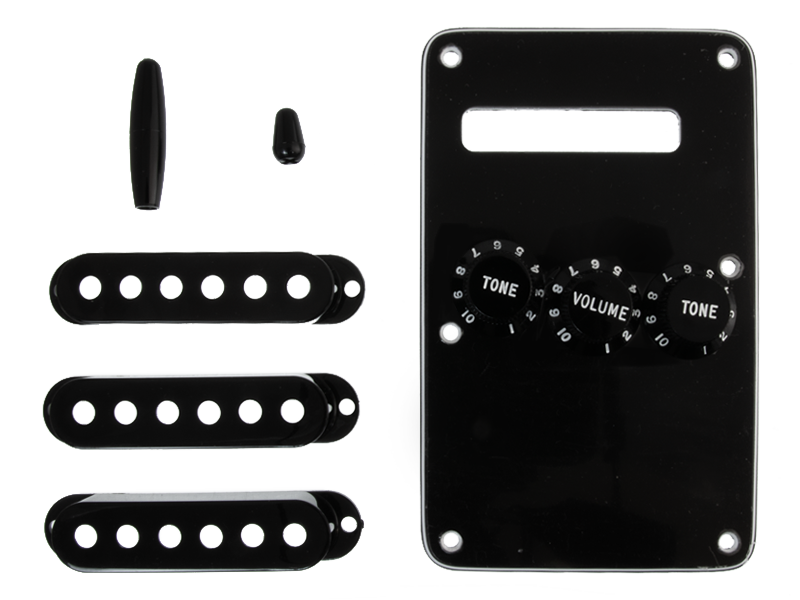 Change the look of your Stratocaster easily and affordably with a Stratocaster Accessory Kit. Contains volume and tone control knobs, pickup switch tip and tremolo arm tip, tremolo backplate and pickup covers (pickup covers do not fit SCN™, N3™ and Noiseless™ pickups).