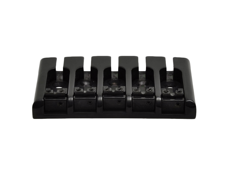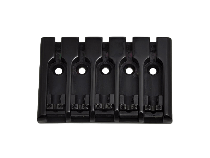 The solid base plate and the single bridges are diecasted like a Badass bridge. The lockable saddles for each string are made of steel. Great combination of materials. Great sound! String spacing 16.8mm +/- 1mm.