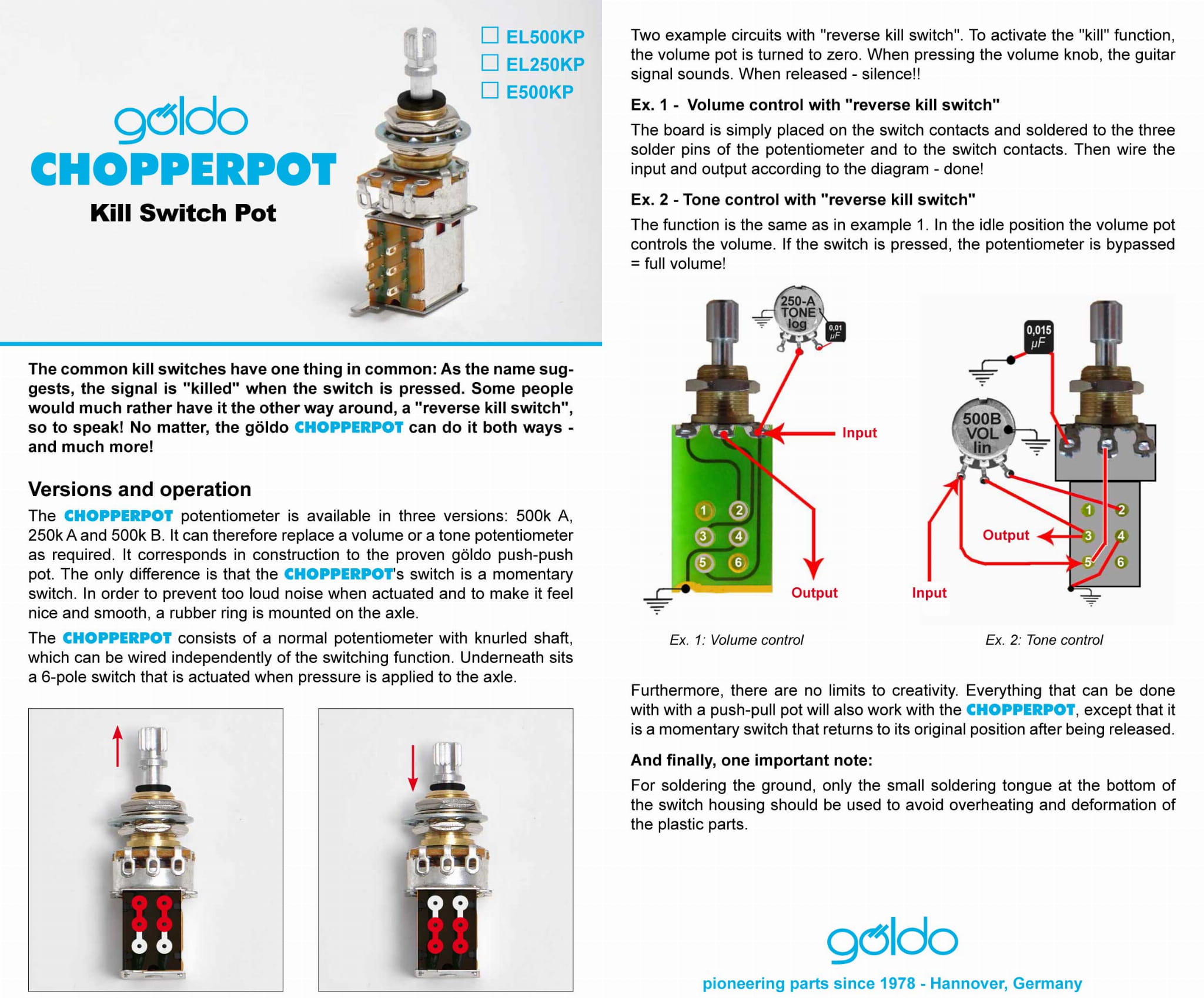 Göldo CHOPPERPOT Killswitch-Poti The common kill switches have one thing in common: As the name suggests, the signal is "killed" when the switch is pressed. Some musicians would much rather have it the other way around, a "reverse kill switch". No matter, the göldo CHOPPERPOT can do it both ways - and much more! Versions and operation The CHOPPERPOT potentiometer is available in three versions: 500k A, 250k A and 500k B. It can therefore replace a volume or a tone potentiometer as required. It corresponds in construction to the proven göldo push-push pot. The only difference is that the CHOPPERPOT's switch is a momentary switch. In order to prevent too loud noise when actuated and to make it feel nice and smooth, a rubber ring is mounted on the axle. The CHOPPERPOT basically consists of a standard potentiometer with knurled shaft, which can be wired independently of the switching function. Underneath sits a 6-pole switch that is actuated when pressure is applied to the axle. Incl. extra printed soldering board (see Instructions).