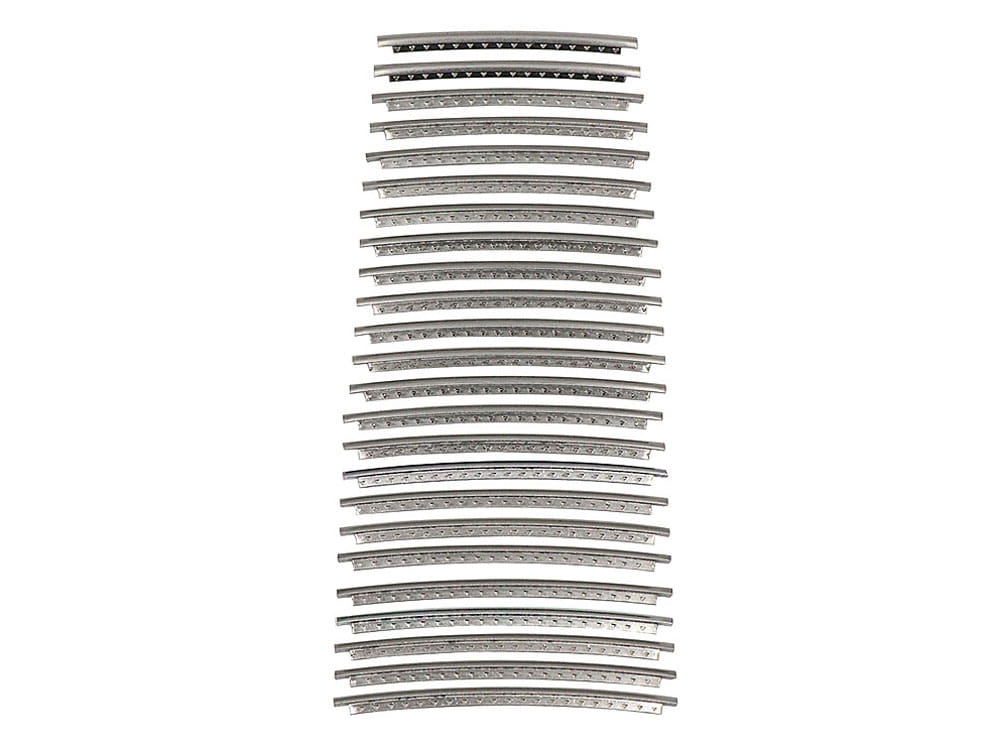 Each fret of the following precut stainless-steel fret wire is cut based on a standard fretboard (43mm at nut / 53mm at 12th fret) and has an extra length by 0.5mm.