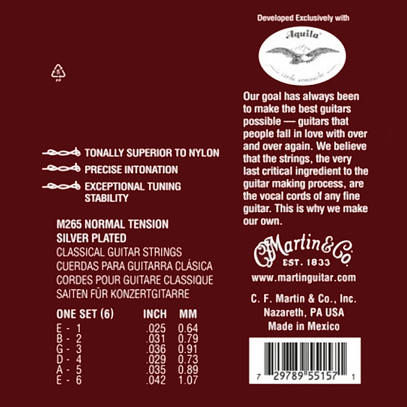 Martin’s premium classical strings are tonally superior to nylon. The proprietary synthetic material emulates gut strings that have been around for centuries. Magnifico™ strings, developed exclusively with Aquila, offer precise intonation and exceptional tuning stability. All Nazareth-made nylon guitars and custom produced nylon guitars are strung with Martin’s Magnifico™ premium classical strings. Unlike Martin’s standard classical strings, which have a ball-end, Magnifico™ classical strings will be offered only with the traditional tie-end.