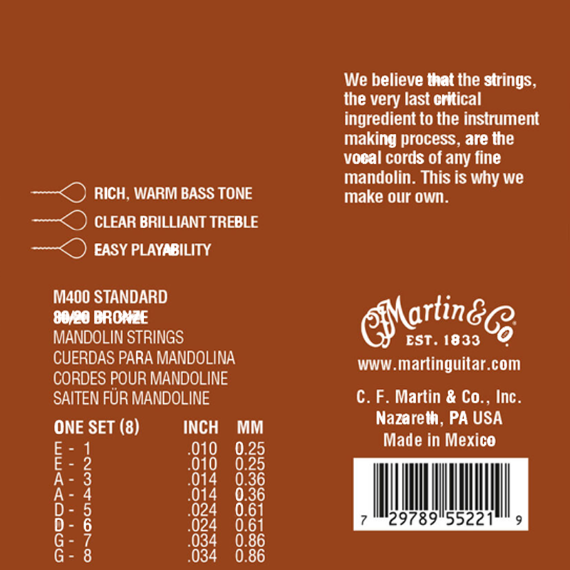 Dance across the fretboard with speed and fluidity. The Mandolin is a splendid instrument that has become an integral member of the American Bluegrass band. Martin Mandolin strings are crafted to provide rich, warm tones and brilliant long lasting trebles.