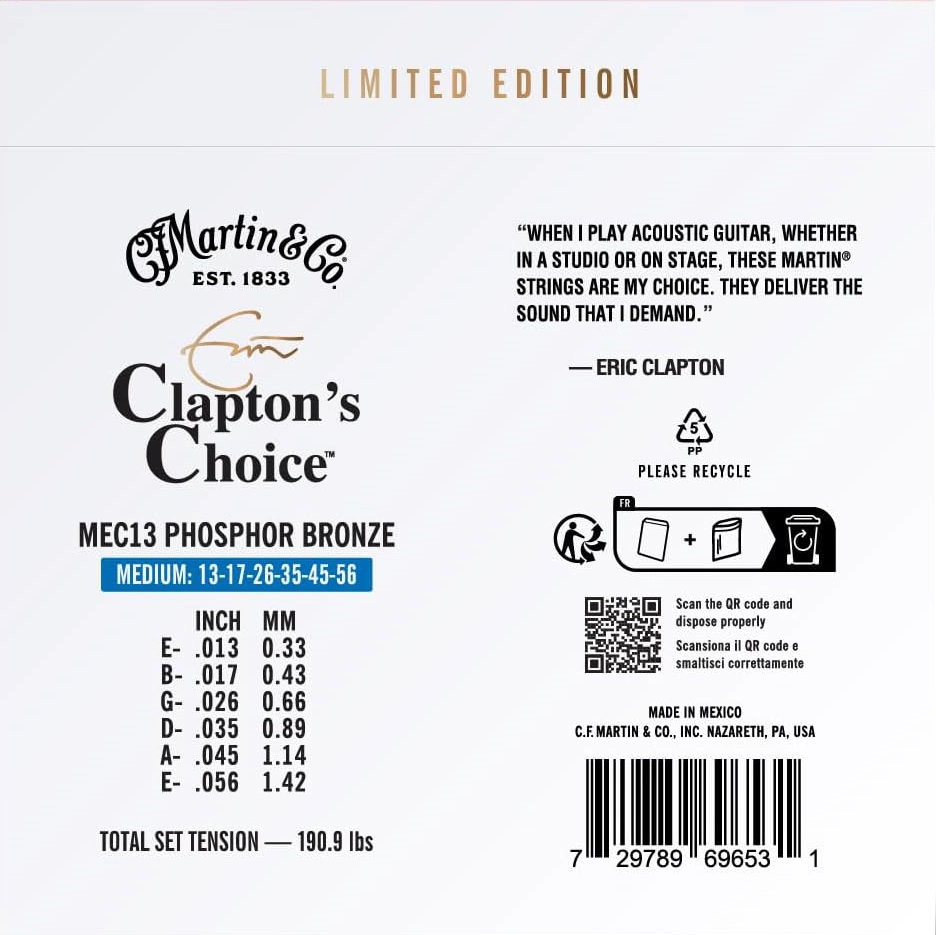 Eric Clapton loves his Martin acoustic guitar strings so much that he wanted to endorse them. We are proud and honored that Martin Guitar makes the strings that Eric trusts to produce his legendary guitar sounds. What does Eric have to say about Martin Strings? "When I play acoustic guitar, whether in a studio or on stage, Martin Strings are my choice. They deliver the sound that I demand." Music to our ears. Available in light and medium gauge 92/8 Phosphor Bronze. Eric Clapton strings are approved for studio and stage, engineered to resist corrosion with legendary tone and playability.