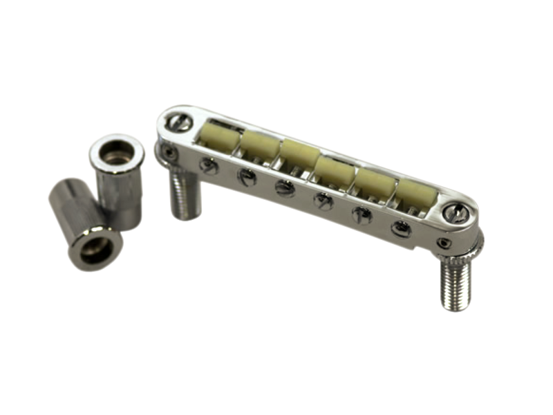 High class, locking tune-o-matic bridge for electric guitars. Replacement for bridges used in Asian guitars with wider studs. This design improves the guitar sustain. Allen key included.