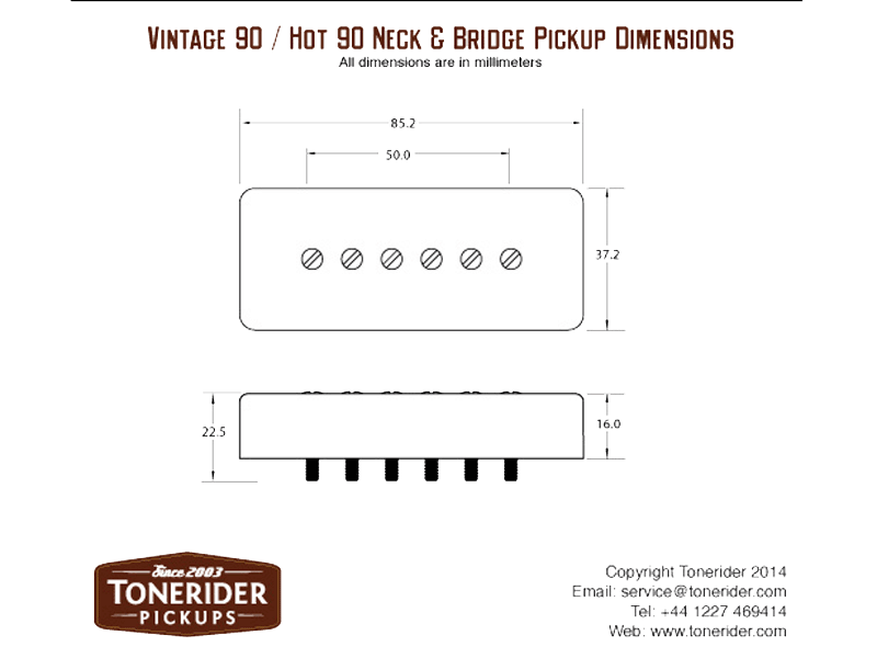 Construction-wise, each Hot 90 pickup offers incredible attention to detail. Nickel-Silver is used for the baseplate, and the hook-up wire is vintage-spec braided single conductor wire. The neck and bridge pickups are a RWRP set, offering hum-cancelling performance in mid-position when used with a standard three-way toggle.
