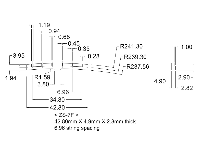 *The ZS-7F is designed to fit either a flat or radiused nut shelf. Leave the middle nub for flat, or sand it down for a radius.