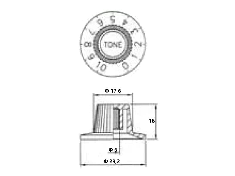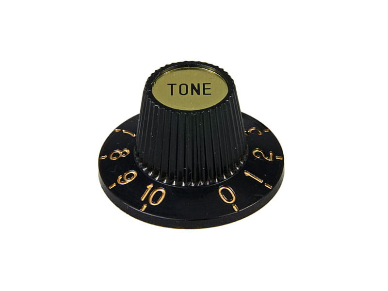 Wciskana, metryczna gałka typu Witch Hat do gitar elektrycznych. Gałki Witch Hat (zwane także Amp - od podobieństwa do gałek we wzmacniaczach Fendera) pojawiły się pod koniec 1966 w gitarach firmy Gibson serii ES i były stosowane do 1981 roku. W późniejszym okresie stosowane były również w gitarach Fender'72 Deluxe Telecaster.