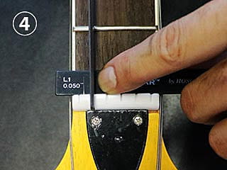 Po wybraniu podkładki Groobar™ o grubości odpowiadającej żądanej wysokości struny na siodełku wystarczy doszlifować siodełko do momentu kontaktu pilnika z podkładką. Dzięki temu nigdy nie natniemy siodełka zbyt głęboko co mogło by spowodować brzęczenie strun.
