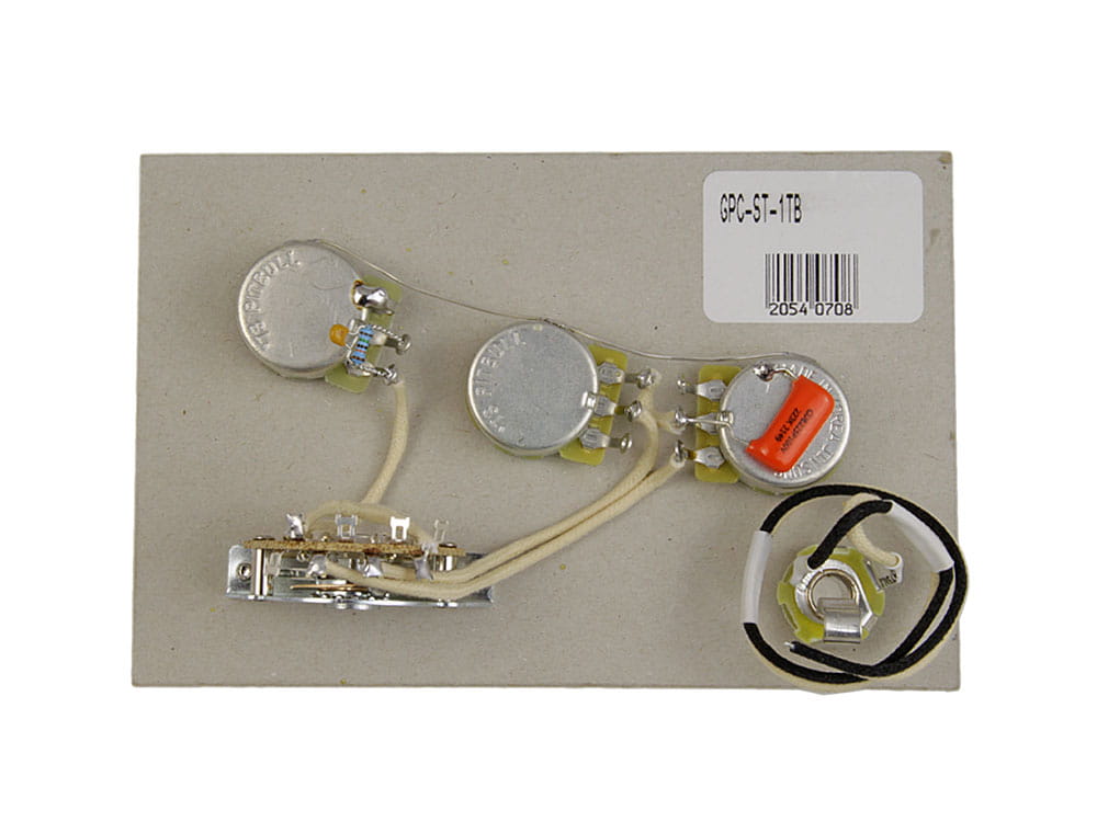 Kompletna, zmontowana i polutowana elektronika do gitary typu Stratocaster® z tradycyjnym układem połączeń.
