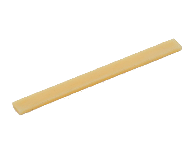 Materiał, surowiec do wykonania siodełka mostka z kości naturalnej. Ta niebielona kość z argentyńskiej krowy, posiada dużą zawartość tłuszczu, która nadaje jej cętkowany, kremowy kolor przypominający skamieniałą kość słoniową. Doskonały twardy materiał o świetnych parametrach brzmieniowych i vintageowym wyglądzie.