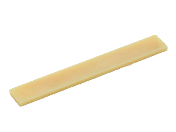Materiał, surowiec do wykonania siodełka mostka z kości naturalnej. Ta niebielona kość z argentyńskiej krowy, posiada dużą zawartość tłuszczu, która nadaje jej cętkowany, kremowy kolor przypominający skamieniałą kość słoniową. Doskonały twardy materiał o świetnych parametrach brzmieniowych i vintageowym wyglądzie.