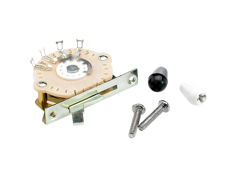 Oryginalny 5-pozycyjny przełącznik Fender® z czarną i białą nakładka do gitar Stratocaster®. Stosowany w gitarach z serii American, American Standard, American Special, Standard i Deluxe.