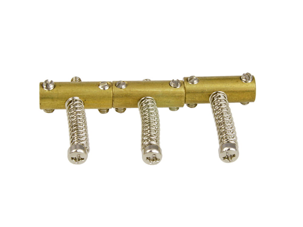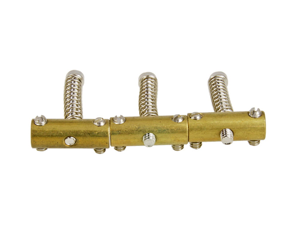Komplet 3 mosiężnych siodełek domostków w stylu vintage Tele® 50's z calowymi gwintami śrub regulacyjnychmenzury (6/32") oraz okrągłym spodem siodełek.