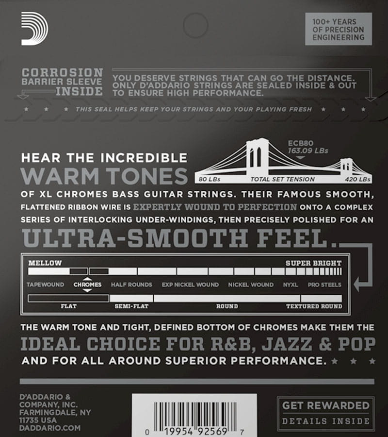 D'Addario Chromes Bass to struny z płaską owijką ze stali nierdzewnej polerowane do uzyskania niewiarygodnie gładkiej powierzchni. Dostarczają charakterystycznego, lekko stłumionego ale bogatego brzmienia jakie zapewnić mogą tylko struny typu flatwound. D'Addrio Chromes to najbardziej popularne struny tego typu na świecie.
