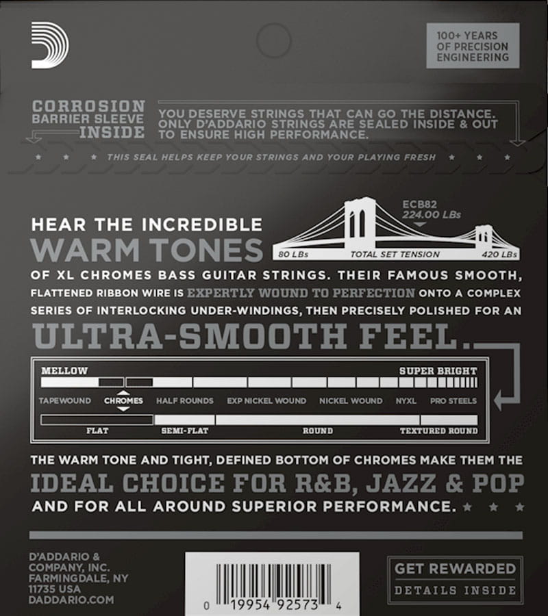 D'Addario Chromes Bass to struny z płaską owijką ze stali nierdzewnej polerowane do uzyskania niewiarygodnie gładkiej powierzchni. Dostarczają charakterystycznego, lekko stłumionego ale bogatego brzmienia jakie zapewnić mogą tylko struny typu flatwound. D'Addrio Chromes to najbardziej popularne struny tego typu na świecie.