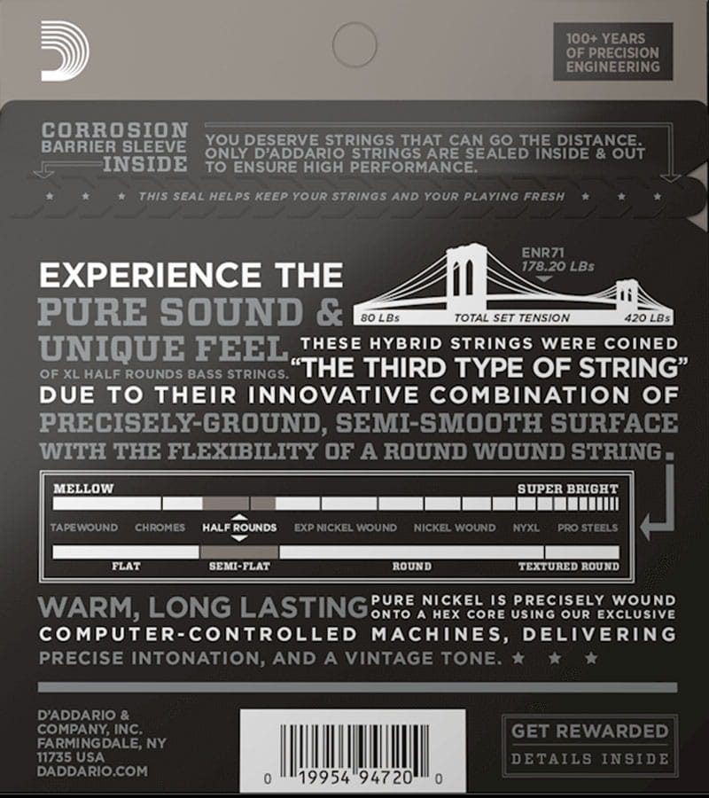 Struny do basu D'Addario Half Round posiadają owijkę z czystego niklu precyzyjnie szlifowaną do uzyskania gładkiej, prawie płaskiej powierzchni. Dzięki temu zabiegowi otrzymujemy struny które zachowują sprężystość a dzięki wyjątkowej technologii hartowania oferują brzmienie i sustain tradycyjnych strun z okragłą owijką.