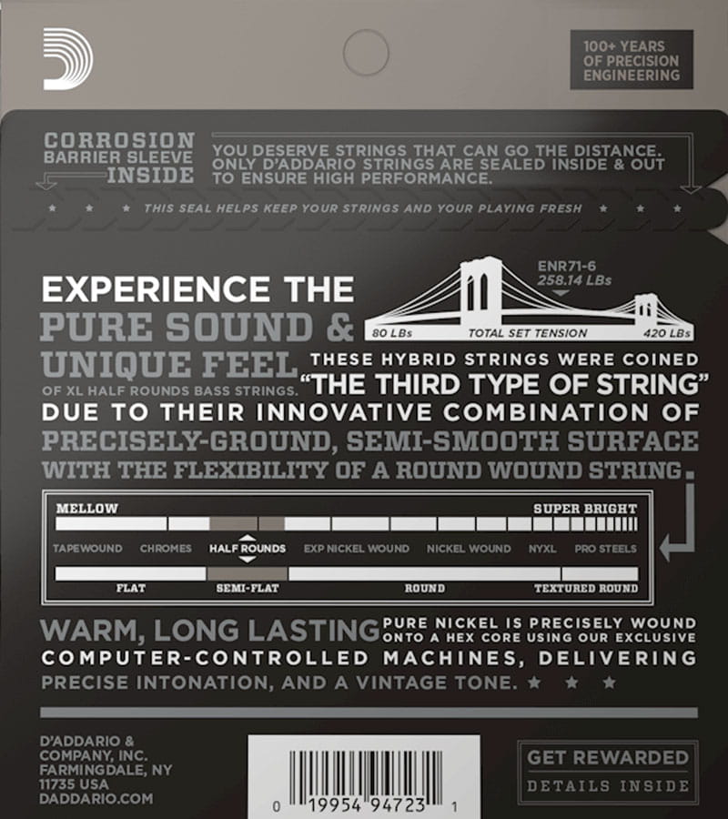 Struny do basu D'Addario Half Round posiadają owijkę z czystego niklu precyzyjnie szlifowaną do uzyskania gładkiej, prawie płaskiej powierzchni. Dzięki temu zabiegowi otrzymujemy struny które zachowują sprężystość a dzięki wyjątkowej technologii hartowania oferują brzmienie i sustain tradycyjnych strun z okragłą owijką.