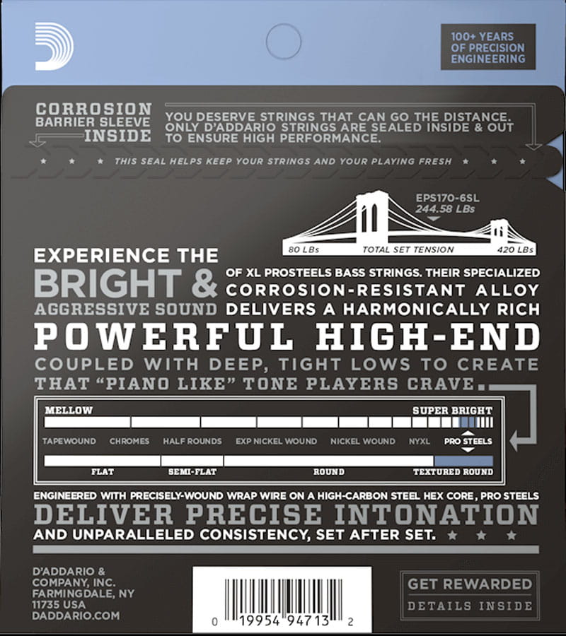 Firma D'Addario to jeden z najbardziej popularnych producentów strun na świecie. Ta rodzinna firma posiada tradycję tworzenia strun od XVII w. i z powodzeniem łączy ją z najnowyszymi materiałami i technologią, oferując rewelacyjne struny do praktycznie każdego instrumentu. Struny D'Addario są wybierane przez najlepszych muzyków niezależnie od stylu czy instrumentu na którym grają. Struny D’Addario ProSteels to najjaśniejsze w brzmieniu i najbardziej odporne na rdzę struny tego producenta. Specjalny stop stali sprawia, że ich brzmienie jest bogate harmonicznie, pełne lśniących górnych częstotliwości i ze skupionym dołem, co w całości daje poszukiwane przez basistów brzmienie fortepianowe. Świetnie sprawdzają się zarówno przy graniu palcami lub mocnym graniu kostką. Struny ProSteels sprawią, że bez problemu Twój bas przebije się w miksie.