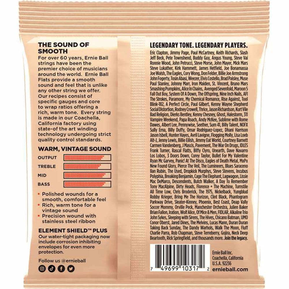 Struny z serii Ernie Ball FLATS Electric Guitar Flatwound Stainless Steel posiadają polerowaną płaską owijkę wykonaną ze stali nierdzewnej. Dzięki temu są głądkie w dotyku i oferują ciepłe, okrągłe i klasyczne brzmienie.