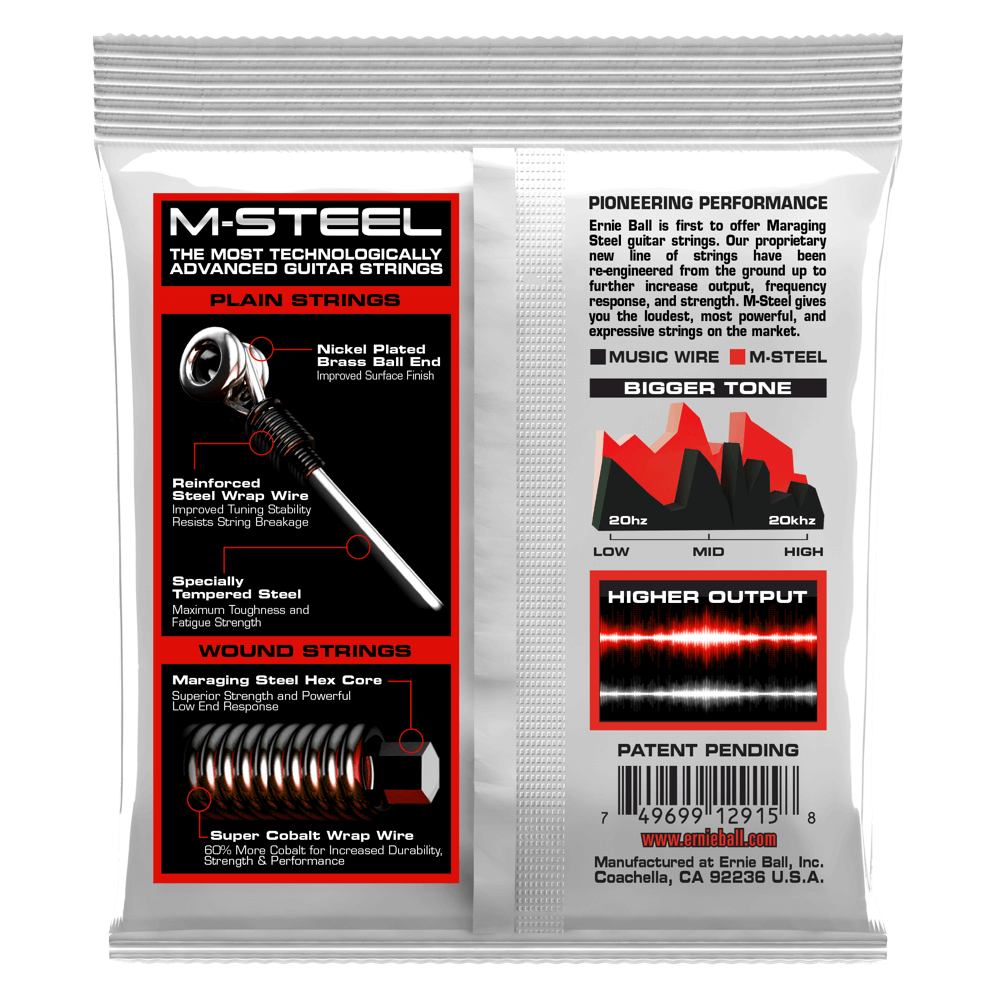 Struny z serii Ernie Ball M-Steel Electric Guitar Strings posiadają owijkę z opatentowanego stopu Super Cobalt nawiniętą na rdzeń ze wzmacnianej stali maraging o sześciokątnym przekroju. Takie struny zapewniają bogatsze i pełniejsze brzmienie z mocnym dołem. Struny bez owijki z kompletu M-Steel zostały wykonane ze specjalnie wzmacnianej stali czego efektem jest maksymalna trwałość i odporność na pękanie.