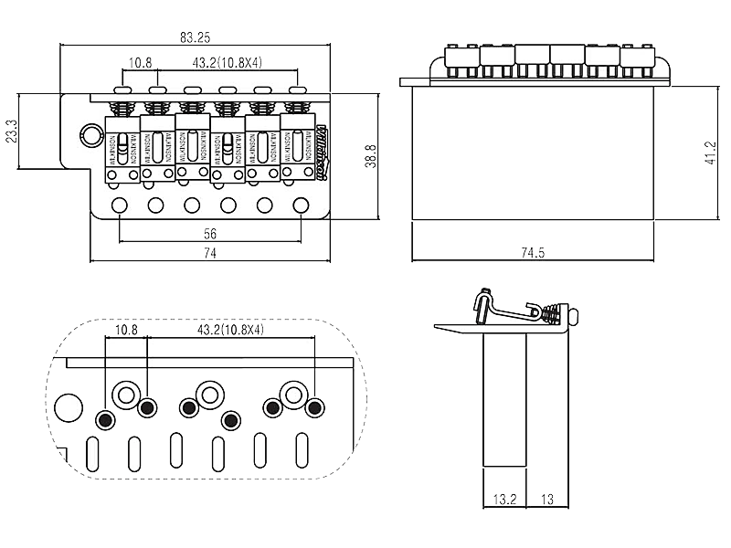 Wysokiej klasy klasyczne tremolo w stylu vintage. Wersja z pełnowymiarowym cynkowym blokiem i siodełkami z giętej hartowanej stali. W skład zestawu wchodzą śruby mocujące, wciskane ramię, uchwyt i 4 sprężyny.