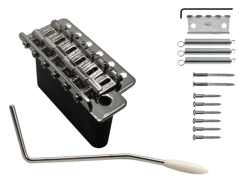 Wysokiej klasy klasyczne tremolo w stylu vintage. Wersja z pełnowymiarowym cynkowym blokiem i siodełkami z giętej hartowanej stali. W skład zestawu wchodzą śruby mocujące, wciskane ramię, uchwyt i 4 sprężyny.