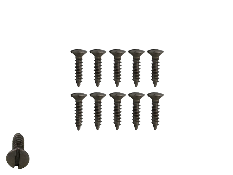 Komplet 10 wkrętów do mocowania pickguardów maskownic i płytek elektroniki. Proste nacięcie było stosowane w pierwszych modelach Fender Telecaster z lat 50-tych. Dopiero w następnych latach pojawiły się wkręty z łbem typu Phillips (krzyżak).