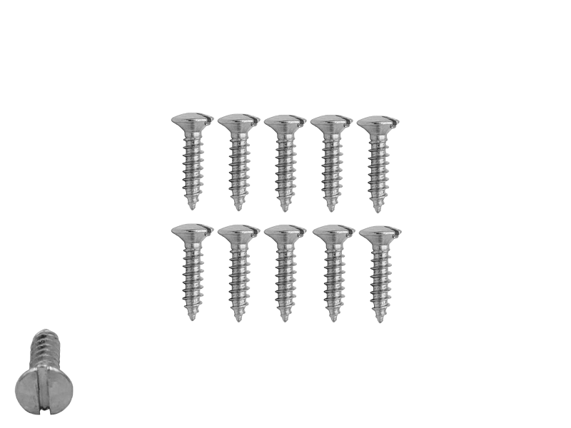 Komplet 10 wkrętów do mocowania pickguardów maskownic i płytek elektroniki. Proste nacięcie było stosowane w pierwszych modelach Fender Telecaster z lat 50-tych. Dopiero w następnych latach pojawiły się wkręty z łbem typu Phillips (krzyżak).
