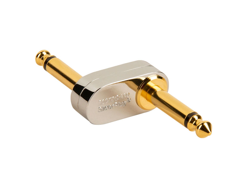 RockBoard Slider Plug to superkompaktowa złączka do efektów, z regulowaną pozycją wtyku. Całkowita długość to jedynie 75 milimetrów, od końcówki do końcówki, oraz 12 milimetrów między wtykami, co sprawia że efekty mogą być teraz jeszcze bliżej siebie. Slider Plug pomaga w jeszcze lepszym połączeniu efektów z bocznie zamontowanymi gniazdami, sprawiając że nasz pedalboard wygląda schludnie i elegancko.